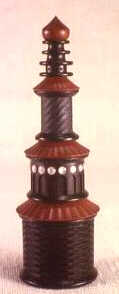 Tiered Pagoda Series, No. 1. African blackwood, pink ivory, pink mother-of-pearl cabochons. No. 1 in a limited edition series of 4 pieces. Based on Japanese Shinto temple architecture with diminishing sizes of pagoda forms towards the top of the structure. Base drum is decorated with a delicate v-cut giving a perforated effect. The curving roof atop each drum is fluted with a convex round bit. The second level consists of 12 arcades topped by a "light" made of 4-mm pink mother-of-pearl gemstone cabochons. The third level is a very fine (only 0.030" wide) indexed spiral pattern. Surmounting the third level roof is a blackwood pinnacle topped by a flame finial of pink ivory. The first and second level roofs lift off to expose miniature box compartments within. An experiment in design to create a series of pieces with the same design but different materials throughout.