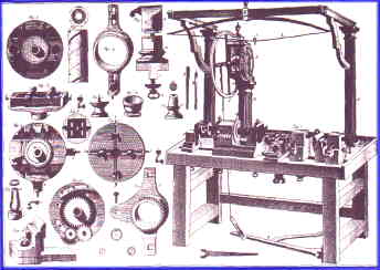 A French Ornamental Turning Lathe of 1790 showing the degree of development of the lathe by this time. Accessories pictured show a boring collar, a simple geometric chuck, elliptical turning chuck and other work chucks and accessories. Note this method of overhead drive with bow and high-mounted flywheel. This was by this time a highly complex machine with a traversing mandrel which would cut screws of up to six different pitches. It was driven by a treadle, aided by the bow-spring overhead and the flywheel, and capable of very intricate work.(From Bergeron's L'Art du Tourneur, 1796.)
