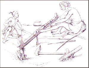 The drawing depicts the turner sitting down and guiding the turning tool across the tool rest with his toes while controlling the tool at its handled end with his hands. An assistant provides power by alternatively pulling on each end of the cord wrapped around the workpiece. (From Holtzapffel, vol. IV)