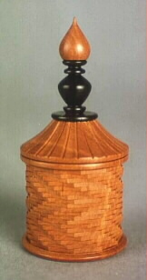 Mountain mahogany box with Z-pattern indexed basketweave pattern and V-scored roof. African Blackwood vase-shaped finial with mountain mahogany finial tip in onion-dome shape.