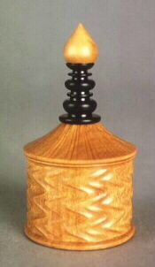 Satinwood box with 3-wave pattern and v-scored roof. African blackwood finial with satinwood onion-dome shaped finial tip.