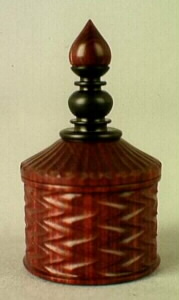 Fuchsia Dymondwood with 4-wave pattern and cove-fluted and scalloped roof. African Blackwood finial with Dymondwood finial tip in onion-dome shape.