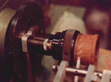 The Universal Cutting Frame is oriented with the cutter rotating in a vertical plane. The index plate on the left is locked in place by the spring-loaded detent. A pattern of cuts is being placed on the workpiece with a 0.100" square cutter. The pattern is a gentle spiral of 12 cuts around the circumference, effected by shifting the starting point of each layer of cuts on the index plate by 2 holes on the 144-hole circle.
