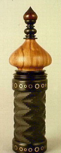 A very strongly contoured Italian olivewood kokoshnik, or onion dome, as utilized on Russian Orthodox churches surmounts this piece. A blackwood finial styled after the Taj Mahal gives a very eastern aesthetic to this perfume bottle. The upper finial is snakewood. The base is African Blackwood, cut in an undulating "3-V" or chevron basketweave pattern. The foot and waist bands of the bottle are inlaid with brass tubes of varying sizes, filled with black Delrin rods. The pattern of the cuts is highly reflective and gives an illusion of movement when slowly rotated in the light. An improved O-ring coupler securely holds the glass bottle liner in the base, yet allows for easy removal to fill with fragrance.