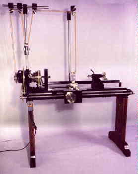 A Modern Ornamental Turning Lathe. This lathe has a 14" swing over the bed, 8" over the side rest, and is 38" between centers. The spindle nose is 1"-8 TPI. The spindle and tail stock have a #2 Internal Morse Taper. The bronze headstock pulley has five speed steps, 600-2400 RPM, index plate with 96, 112, 120, 144, and 192 holes, with an adjustable index pin, and a 180 tooth worm gear for indexing or slow motion drive. The bed is steel, and the ways are 1" dia. hardened and ground, spaced 10" apart. The motor is 1 HP, 110 volt, 1725 RPM. The overall length is 69", the width is 33", the height to the top of the head stock is 51", and the height to the top of the overhead drive is 84". The weight is 750 pounds. The lathe is painted black, has many bronze parts, and 3" thick genuine Mahogany legs. Standard ornamental turning equipment includes an Ornamental Slide Rest, Spiral Apparatus (16 gears for threading and spiraling), Curvilinear Apparatus (for full length tracing on the lathe), Overhead Drive System, Universal Cutting Frame and cutters, and the Drill Cutting Frame and cutters. Standard accessosries include a spur drive center, live tail stock center, face plate, 1" pin chuck, 3/4" pin chuck, and one set of wrenches. Available as accessories are an Eccentric Cutting Frame, Reciprocator, Ellipse Chuck and Cam Ring, a Compensating Index for the equal division of the ellipse, Eccentric/Rectilinear Chuck, Deep Cutting Frame, Fluting Stops, and slow-motion Gear Motor Drive.