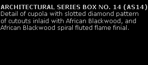 These boxes are designed with architectural themes as the main motif. They are inspired by Classical and Palladio motifs and oriental design details. Rounded classical or Moghul domes, cupolas and colonnaded finials are some of the elements utilized on the lids of these ornamented cylindrical drum bodies. There is a contact form to follow up on price and availability of any pieces of interest.