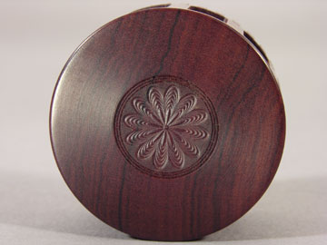 These small, flat boxes have rose engine patterns on top and inside the lids, a small rose insignia pattern on the bottom and a variety of patterns on the sides. They are reminiscent of antique snuff boxes in shape and size. Each is a one-of-a-kind piece, and they have been crafted from a variety of woods and synthetic materials. Gallery 1 consists of all wood pieces. The thumbnail index is organized from right to left in each row with views of the top, side, bottom and inside of lid for a single box. Click any thumbnail image to see a larger view on the right. There is a contact form to follow up on price and availability of any pieces of interest.