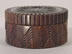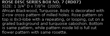 These small, flat boxes have rose engine patterns on top and inside the lids, a small rose insignia pattern on the bottom and a variety of patterns on the sides. They are reminiscent of antique snuff boxes in shape and size. Each is a one-of-a-kind piece, and they have been crafted from a variety of woods and synthetic materials. Gallery 2 consists of all wood pieces. The thumbnail index is organized from right to left in each row with views of the top, side, bottom and inside of lid for a single box. Click any thumbnail image to see a larger view on the right. There is a contact form to follow up on price and availability of any pieces of interest.