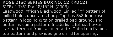 Rose Disc Series Box Gallery 2These small, flat boxes have rose engine patterns on top and inside the lids, a small rose insignia pattern on the bottom and a variety of patterns on the sides. They are reminiscent of antique snuff boxes in shape and size. Each is a one-of-a-kind piece, and they have been crafted from a variety of woods and synthetic materials. Gallery 2 consists of all wood pieces. The thumbnail index is organized from right to left in each row with views of the top, side, bottom and inside of lid for a single box. Click any thumbnail image to see a larger view on the right. There is a contact form to follow up on price and availability of any pieces of interest.