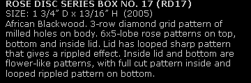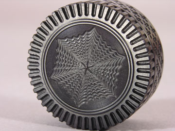 These small, flat boxes have rose engine patterns on top and inside the lids, a small rose insignia pattern on the bottom and a variety of patterns on the sides. They are reminiscent of antique snuff boxes in shape and size. Each is a one-of-a-kind piece, and they have been crafted from a variety of woods and synthetic materials. Gallery 3 consists of all wood pieces. The thumbnail index is organized from right to left in each row with views of the top, side, bottom and inside of lid for a single box. Click any thumbnail image to see a larger view on the right. There is a contact form to follow up on price and availability of any pieces of interest.