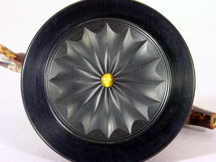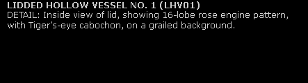 This series of work consists of thin wall hollow turnings with an ornamented lid. The body of each piece is plain turned with the goal of achieving a somewhat uniform wall thickness in the range of 1/8-1/4". This is technically challenging work that cannot be controlled by machine, so it requires careful freehand control of the hollowing tool to achieve the thin wall design of the body without breaking through the delicate wall. The inside is sanded smooth and finished as well. The lids are a variety of ornamental designs intended to complement the shape, color and figure of the body of the piece. In some pieces, the body is highly figured burl wood, or else it is chosen for its color or figure if it is not burl wood. The thumbnail index is arranged in succession from right to left, beginning at top right, and the captions are uniquely numbered for each piece. Click a thumbnail image below to view a larger image. There is a contact form to follow up on price and availability of any pieces of interest.