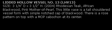 lid. The body of each piece is plain turned with the goal of achieving a somewhat uniform wall thickness in the range of 1/8-1/4". This is technically challenging work