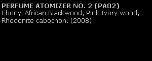 These vessels contain removable/refillable perfume atomizers to serve as scent holders. The bodies are made of Ebony and styled in a disc form with fluted edges, a burl inlay and some have a rose engine center disc of African Blackwood. The fluted caps are made of African Blackwood, topped with a cabochon of the same wood used in the body. The removable perfume atomizer is supplied with an accordion-style syringe to use for filling from a source bottle. Dimensions for all the pieces in this series are similar: diameter of the body is about 2 3/4", thickness varies from 1 1/4" - 1 5/8", and height is about 3 3/4".