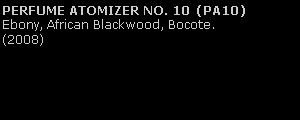These vessels contain removable/refillable perfume atomizers to serve as scent holders. The bodies are made of Ebony and styled in a disc form with fluted edges, a burl inlay and some have a rose engine center disc of African Blackwood. The fluted caps are made of African Blackwood, topped with a cabochon of the same wood used in the body. The removable perfume atomizer is supplied with an accordion-style syringe to use for filling from a source bottle. Dimensions for all the pieces in this series are similar: diameter of the body is about 2 3/4", thickness varies from 1 1/4" - 1 5/8", and height is about 3 3/4".